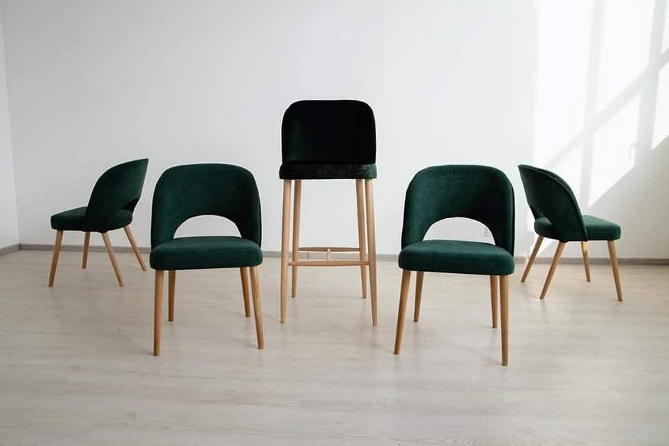- Textilie: Do interiérů vstupují plyšové látky, hrubé úplety, samet a vlna v zemitých barvách nebo hlubokých tónech, jako je lesní zeleň, petrolejová modrá nebo bordó. Tyto materiály najdete na dekoračních polštářích, přehozech nebo kobercích. Ideální jsou také čalouněné židle. Například naše jídelní židle Loft je skvělou volbou.
